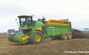 A big metal auger pulls manure onto a center-mount conveyor that moves it up under the cab and back into a spreader on back of the articulated rig. Vertical beaters spread manure out the back.