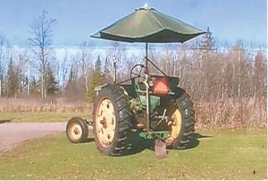 I mounted a 6-ft. wide patio table umbrella on my Deere 50 tractor. I attached a 1 1/4-in. dia. pipe to the tractor drawbar for it to fit into and also Velcroed it to the tractor seat. The umbrella happened to be green like the tractor. It works great and really makes a difference on hot, sunny days.