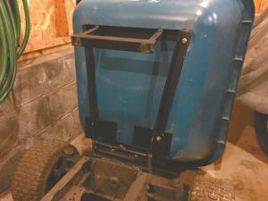 Gunter removed an 8 cu. ft. plastic tub from an old wheelbarrow and bolted it to the front on angle iron with support brackets and round stock with grease fittings to create a hinge.