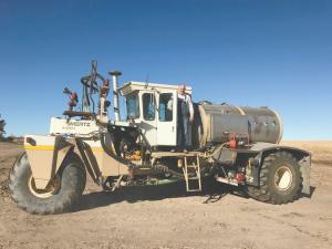 The Mertz floater carries three tanks including a large 1,600-gal. tank and two 50-gal. tanks. With throttle controls, May can adjust the pump pressure, and on its highest setting can empty the 1,600-gal. tank in 20 min.