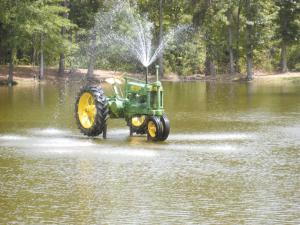 He had the Farmall B tractor installed in the 5-ft. deep pond about 10 years ago. Efurd drove four pipes deep in the mud and welded two “saddles” to hold the frame of the tractor just above the water. A 10-hp. pump sprays water through a 2-in. PVC pipe that comes up through the hood.