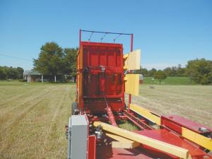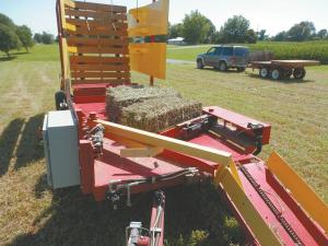 Wagon Loads Bales Onto Pallets In The Field BALE HANDLING When new retiree Ken Anselm put 25 acres back into hay production he knew he was a one-man crew so he built a bale wagon to do the job Not only does it pick up bales it sorts them into alternating positions so each layer “ties” to the previous layer What’s more the wagon stacks the 6-bale layers against a pallet Once the pallet has 4 or 5 layers against it the bale wagon tilts the pallet and bales 90 degrees and sets the loaded pallet on a trailer “When I was a senior in high school I purchased a ’49 Ford flatbed truck and some of my buddies and I followed a baler around all summer ” says Anselm “We had a lot of fun and made good money However these days there is no way you can get kids to help hay I decided if I was going to produce small square bales for the horse market I would have to make it a one-man job ” Anselm saw various systems for larger scale hay producers but they would have required large investments and a larger tractor He knew his 30 hp New Holland 1620 couldn’t handle a grapple full of bales A broken leg and 6 months forced recuperation gave him time to plan an alternative By the time he was back on his feet the plans were complete They called for an all-hydraulic wagon 86 in wide and about 24 ft long He calls it his Hayday machine A programmable logic controller PLC is key to the machine’s operation It is connected to sensors that provide it with information that activates various electric- over-hydraulic controls This allows Anselm to concentrate for the most part on steering the tractor while the Hayday Machine does the work The machine consists of 4 parts The first is a pickup conveyer that swings out from between the wagon and the tractor A hydraulic motor drives pickup chains that grab bales and deliver them to the sorting platform As bales arrive on the sorting platform multiple arms operated by hydraulic cylinders push successive bales into 6 preset positions on the loading platform Once all 6 bales are in place 2 cylinders tip the loading platform to a vertical position depositing the bales against a 4 1/2 by 6-ft pallet While a bale is being sorted or the platform is moving the pickup conveyor stops When the sorting platform drops back into place bale pickup resumes If the platform has emptied new bales are sorted into a different configuration The pallet with its layer of bales sits at about a 10-degree angle against the forks of a forklift mast installed on its back at the rear of the HayDay Machine A series of slats extend across the face of the mast supporting the bottom edge of the bale layer “When the first layer of bales is pushed into place the forks are near what would be the top of the mast ” explains Anselm “As each successive layer is pushed into place the forks move down the mast and the slats move with them ” When the desired numbers of layers are in place a large cylinder tips the forklift mast upright This puts the forks and pallet in a horizontal position At that point they can be placed on the wagon for transport to storage “I can select either 4 or 5 layers per pallet in the PLC programming and do a manual override of the PLC to move the tongue or pickup left or right ” says Anselm “Otherwise the PLC controls the cylinders and the order of activation Sorting alone requires as many as 5 cylinders to turn a bale a certain way ” While there are a total of 14 cylinders and a hydraulic motor the small tractor has plenty of power No more than 2 cylinders are ever in action at any one time While electronic and hydraulic components were new many other components were repurposed “My 93-year-old dad Bernard is a big fan of FARM SHOW and has always made tools and any contraption he needed out of his scrap piles ” says Anselm “He taught us kids to make do and not be afraid of tackling anything That’s how I was raised ” While he didn’t have scrap for everything he needed Anselm did use the axle wheels and some tubing from an old Allis Chalmers planter The forklift mast was salvaged from a Hyster 50 Anselm stacks 4 layers on his homemade pallets if storing them 2 high in his barn He bought an old forklift for that part of the job He stacks layers 5 high if they will be delivered to a customer The system works well he says “I only bale about 2 500 bales a year and with the HayDay Machine I can pick up as many as 500 bales a day ” says Anselm He figures he has about $45 000 invested in the machine close to half of it just in the hydraulics While a grandson did much of the welding for him Anselm designed and installed the hydraulics and electronics as well as programming the PLC “I used to work in manufacturing and we built machines using controllers of various types I also had experience developing programs for PLCs ” says Anselm Contact: FARM SHOW Followup Ken Anselm P O Box 187 Le Center Ky 42056 ph 270 519-1010; Ken@sistersandfriends net