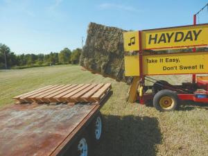 The pallet with its layer of bales sits at about a 10-degree angle against the forks of a forklift mast installed on its back at the rear of the HayDay Machine. A series of slats extend across the face of the mast, supporting the bottom edge of the bale layer.