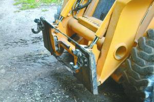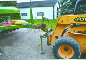 The 2 men found it difficult to maneuver the drill into a tight parking spot in their shed while it was hooked up to the tractor. Their solution was to bolt a couple of truck pintle hooks onto the quick-tach plate on their skid loader.