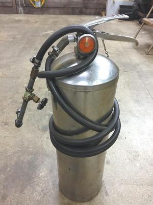Jon Arms, Brewster, Mass.: “I use a surplus fire extinguisher to add gear oil to gearboxes. I fitted it with a pressure hose and a 1/4-in. nip valve. It holds about 2 gal. of oil, added through the top nut that holds the handle and dip tube. Air is added through the snifter valve at the top beside the pressure gauge.