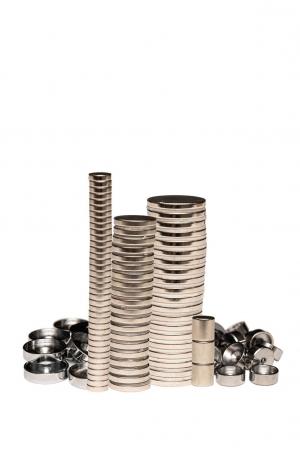 Beechy stocks magnets in sizes from 3/8 in. dia. to 1 in. dia., and sells them individually or in lots of 10, 100, 1,000 or more with reduced per/unit prices. For example: 1-in. magnets cost $2.50/each or $1.30/each for 100 or more (plus shipping). Beechy also sells steel cups to hold the magnets, which increases magnet strength and protects them from breaking, and he sells strike plates for magnet contact.