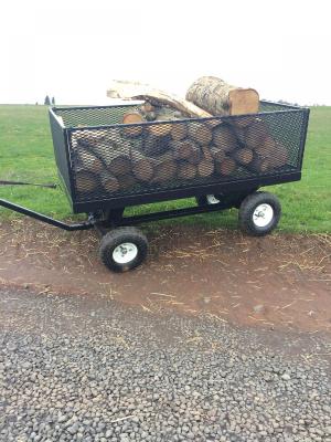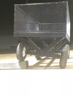 The cart measures 4 ft. long by 2 ft. wide and rides on 10-in. wheelbarrow tires. It has removable 1-ft. tall, expanded metal sides and an expanded metal floor. It can be pulled either by hand or behind a small tractor.