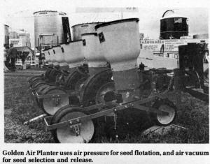 The new planter features an exclusive combination of air pressure (for seed flotation) and air vacuum (for seed selection and release). A single pump operated from the tractor PTO provides both air pressure and air vacuum to each planter unit. A dual air chamber is built right into the main pull bar, permitting operation as a 4-row, 6-row or 8-row planter.