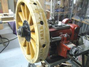 Carter says one of their toughest jobs was building new wooden wheel rims, known as felloe bands, to replace those that were rotted and filled with holes. That required producing new half-circle felloes that they split down the spoke center, then glued them around the spokes in a staggered pattern to create a full circle. They machined the sides and outside diameter on their wheel lathe. Producing new felloes for the dual rear wheels, which weigh about 500 lbs. when assembled, was complicated by having to avoid cutting into the outside steel band, which they later sanded and smoothed to accept solid rubber tires. Overman Cushion Tire in Ohio made and vulcanized tires onto the rims.