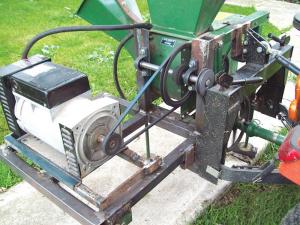 Negen hinged the generator to its base to make the drive belt self-tightening. A spring-loaded pulley keeps tension on the drive belt from the pto shaft and on the belt to the chipper.