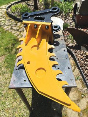 “Digging out big stumps with the 16 and 24-in. buckets on my excavator puts a lot of stress on them and creates big holes in the ground, so I designed and built a special tool to handle the job,” says Mark Yax, Solon, Ohio. “It acts like a big knife to cut roots and lift a stump without doing as much damage as a bucket.”