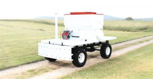“It’s essentially a pickup truck without the cab,” says Allemand. “It’s made completely from steel with a feeding bin and platform. It has all-wheel drive that uses a hydraulic propulsion system taking mechanical energy from a Honda gas motor and turning it into hydraulic wheel power. It’s great in mud and on hills. In our demos, we take it to different geographies and weather systems to show how robust it is.”