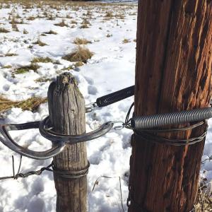 MacLean’s horseshoe barbed wire gate post grabber is a major upgrade from traditional wire loops. It consists of a horseshoe around the post with a second horseshoe welded to it for leverage. Springs linked to the first horseshoe wrap around the end post of the fence line.