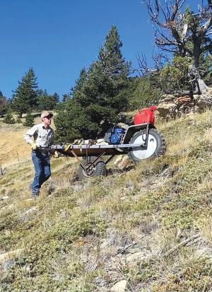 His “contraption” is a cow path variation of a powered wheelbarrow. The in-line wheels are mounted to a platform for carrying chainsaws, supplies and other tools. The drive wheel is off an old Rokon 2-WD motorbike. The rear is off an old quad.