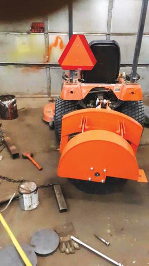 “My grinder mounts on the 3-pt. hitch of my open station Kubota BX2200, a smaller garden tractor that I can maneuver in and around trees,” Waa says. The tractor has 22 hp. and a 540 pto.