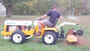 The tiller was designed to mount to the back of a small Allis-Chalmers garden tractor. Bayer adapted it for “Artie,” his 4-WD articulated Cub.