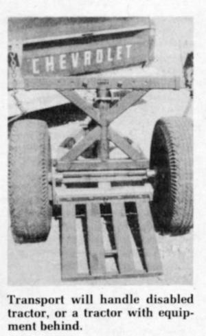 Ends of the lifting arm are adjustable in or out so they can be positioned as needed to clear the tractor's steering tie rod when raising or lowering the tractor. "We've used the cart to tow tractors as large as Deere's 4430," explains Gary Draayer, sales manager. "It will handle a disabled tractor, or a tractor with equipment mounted or hitched behind."
