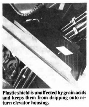 Acids dripping onto the top side of the lower end of the elevator housing eventually eat a hole in the metal. Easton's Rust Shield is made out of tough polyethylene plastic that's unaffected by grain acids. It simply fits into place with a wing nut and a plastic tie strap. Once installed, it has a lower lip that drains acids off to the side of the machine. Sells for $18 plus shipping.