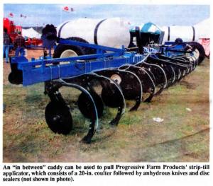 Progressive Farm Products, Bloomington, Ill., equips its strip-till toolbar with 20-in. coulters followed by anhydrous knives and disc sealers. Anhydrous or liquid fertilizer can be deep banded directly behind the knives. An "in-between" spray caddy with a rear 3-pt. hitch can be used to pull the toolbar. A hitch on back of the toolbar is used to pull an anhydrous tank. The toolbar is equipped with markers. Spring downpressure keeps the coulters cutting through heavy residue. A 12-row applicator sells for $13,500. Contact FARM SHOW Followup, Rich Follmer, Progressive Farm Products, Inc., RR 1, I-39, Exit 2, Hudson, Ill. 61748 (ph 309 454-1564).