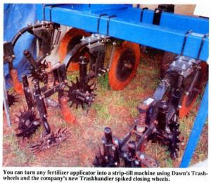 Dawn Equipment Co. recently introduced an add-on strip-till attachment that lets you turn any fertilizer applicator into a strip-till machine using the company's popular row-clearing Trashwheel for row crop planters. The system includes a DMI coulter followed by the spring-loaded Trashwheels, a DMI knife, and new "Trashhandler" closing wheels. Lets you make year-round use of planter Trashwheels. Or, you can purchase new units , allowing one person to