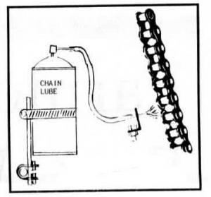 He mounts an aerosol can in a convenient location and runs a clear polyvinyl hose from the canto the chain. Both the can and end of the hose are held in place with metal brackets. The hose is small enough so it fits snugly over the long plastic snout supplied with most aerosol cans. He applies lubrication to the inner side of the chain so that centrifugal force will dispense lube into the chain rather than flinging it off.