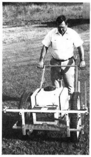"Power is provided by a deep cycle battery that drives a demand pump, which has a much more even spray pattern than a squeeze pump. It uses motorcycle wheels for ease of pushing and boom height is adjustable. A toggle switch turns in on and off, it has a 15-gal. poly tank, adjustable pressure, and a hand gun."