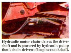 Sachar paid $100 for the front axle off a 1972 Chevrolet 4-WD pickup. The axle was equipped with lockout hubs. He turned the axle upside down and fitted it with an oscillating mount (taken from an International 105 combine) that allows the axle to pivot back and forth. He welded a 3/4-in. steel plate, fitted with a bearing and a hydraulic motor, onto the combine frame ahead of the axle and ran a 12 in. long, 1-in. dia. shaft from there to the axle's original driveshaft. The hydraulic motor chain-drives the drive-shaft and is powered by a hydraulic pump that's chain-driven off the engine crank-shaft.