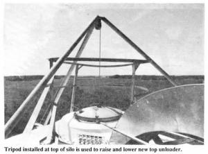 Hanson recently converted a Madison silo, installing an electric winch and tripod on top of the silo to raise and lower the new top unloader. "The farmer was ecstatic with the conversion because he was able to do away with the troublesome bottom unloader. His only other option had been to tear the silo down. There's no sign of weakening at all on the converted silo. Works just like the conventional top-unload silo standing next to it," says Knutson.