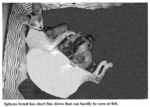 The Sphynx has soft warm skin covered with a very short fine down that can hardly be seen or felt. They have the most hair on the bridge of the nose, backs of the ears, outsides of the feet, and tail. There's virtu-ally no shedding. Kittens are born with loose, wrinkled skin that almost seems too big for them. Most of the wrinkles eventually disappear although the ones on the face remain. Most Sphynx have no whiskers, or very short, stubby whiskers. The cats come in various colors depending on skin pigmentation.