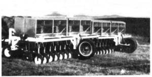 "I had the openers for the double disc openers cast to my own design. The hoppers are made of aluminum and clear plastic so you can always see the level of seed and fertilizer. Special-built feed shaft runs the length of the hopper. It feeds out from the entire length of hopper at one time, so the hoppers totally empty out, completely clean. Seed falls from the feed shaft into funnels that separate seed and direct it to the openers. The front hopper is used for seed and the rear one for fertilizer.