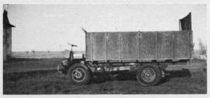To build the wagon, which carries half again what his conventional forage boxes handle, Spader first tore off the fenders, cab and all tin work. Then he moved the steering, clutch, brake and shifting controls out to the front of the truck frame and mounted a seat over what was the front left fender. He then covered the engine ù a flat head 6 cyl. ù and mounted the 7-ft., 8-in., by 14-ft. box on the rear frame. The box has a gate that opens by pulling one lever and closes and locks by itself, and a regular hoist underneath.