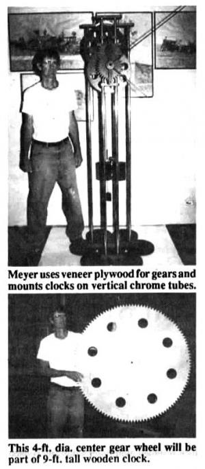 Meyer says he's willing to sell his latest clock (shown) for $500. He's now working on a larger clock that will be 9 ft. tall, 6 ft. wide, and 4 ft. deep. It'll have a 4-ft. dia. center gear wheel. He has made up detailed plans for his first clock and will have other plans available early next year.
