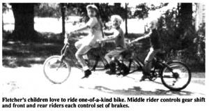 "I took it to a Sunday school picnic last summer and could hardly get the kids off it," says Fletcher, of Waupaca. "I built it be-cause I wanted something different and I had never heard of a home-built bike for three. The front rider must be older because steering takes a lot of strength. My 11-yearold daughter rides in front and my 7- and 9-year-old boys ride behind her. Everyone has a job. The middle rider controls the gear shift and the front and rear riders each control a set of brakes. I added the 5-speed gearshift because with three people peddling you need more than just one gear.
