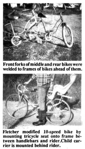 Fletcher also modified a 10-speed bike by mounting a tricycle seat onto the frame between the handlebars and rider. A child carrier is mounted behind the rider. "It lets me carry a 2 or 3-year-old in front of me and a 4 or 5-year old in back," he notes.