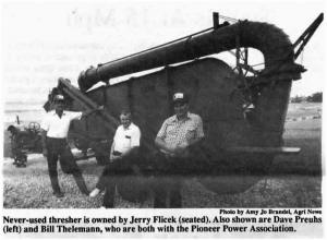 The longer the dealer kept the thresher, the more he became attached to it. He had several offers to buy the thresher, but never sold it. After he died, his son had an auction where Flicek bought the thresher, bidding against farm machinery collectors from across the U.S. He won't say how much he paid. Dave Preuhs, a past president with the Pioneer Power Association, says a similar used model would probably be valued at $100, but says this thresher's value is at least 50 times that. The thresher's permanent home is at the Pioneer Power Association's show site nearLeSueur, Minn.
