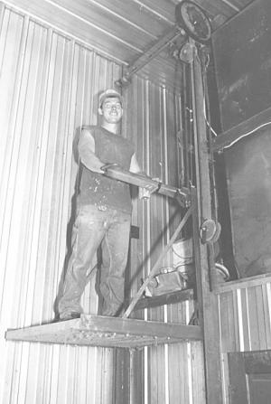 "The elevator is operated from a waste-high, push-button control arm. Power cable is wound around a pulley attached to the up-per T-beam and a weighted pulley below it so it raises and lowers with the lift without tangling."