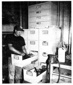 Old file cabinets inside our shop provide dust-free storage for power tools such as grinders, air hammers, air chisels, small battery chargers, paint sprayers, etc., as well as operator manuals and books. We bought the cabinets cheap at an auction in Des Moines. An insurance company had moved into a new building and installed new cabinets to match the building's new decor. They sold their existing cabinets. Some of them had never been used and still had the price tags on them. We set the cabinets on concrete blocks to keep the bottoms from rusting (John Ricks, RL 1, Box 145, WIl-Hams, tows 50271 ph 515 854-2668).