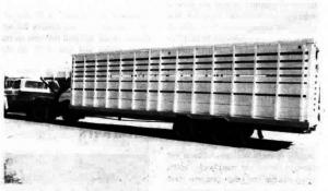Two interior gates made of wire panels on steel frames divide the trailer into three sections. The livestock hauling frame has its own floor and roof so that it stands alone when it's lifted off the flatbed with bin jacks for storage. The trailer is 6 ft., 6 in. tall, 8 ft. wide and can haul 59 hogs weighing an average of 240 lbs. each. It can also be used to haul cattle. Dual wheels and four axles (counting the pickup) make it legal for use on country roads year around. He pulls the trailer with a 1971 Ford 2-ton truck with a shortened wheelbase.
