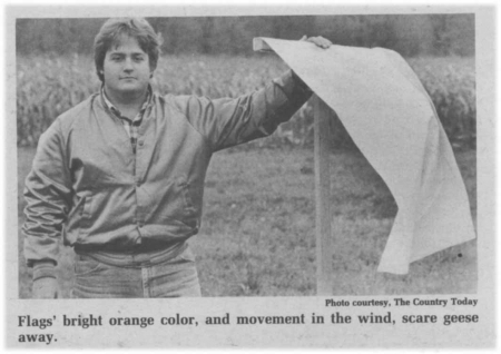 If you have problems with geese ravaging your fields, you may want to "wave" them off with inexpensive orange flags built by Paul Sebo, of the Manitowoc County Soil and Water Conservation Dept., Manitowoc,. Wis., who last fall worked with two area farmers with geese problems. He notes that while the flags don't eliminate geese problems and damage, they do help to reduce problems and are an inexpensive and quiet alternative to cannons and other scare devices.