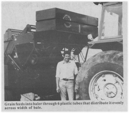 Custom hay harvester Peter Harrison adds grain directly to round bales as they're being formed with the help of a hopper he mounted on the front-end of his New Holland baler.