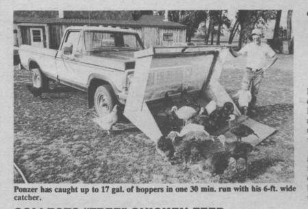 During the summer, Ponzer goes "hunting" for hoppers along country roads, field edges and anywhere else there are hoppers. He generally drives 25 or 30 miles to snag an average catch of 8 to 10 gals. of hoppers but has collected up to 17 gals. on a half-hour run. When he gets home, he hoses down the "catch" with cold water "to slow the hoppers down so our chickens and turkeys can catch them before they get away."