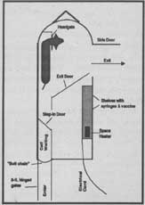Shelving runs down the right side of the trailer for storage of vaccines, syringes, and other tools and supplies.