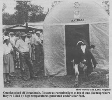 Tent-like fly traps were developed by government researchers in an attempt to get away from the use of insecticides because the notorious Buffalo fly, with which Aussie cattlemen fight a constant battle, has started to build up resistance to chemical forms of control. The Australian dairy industry provided funds to develop a tunnel-like structure which is now on the market from Country Industries in Brendale, Queensland.