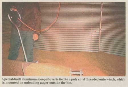 It consists of a winch mounted on the unloading auger outside his bin and a special-built aluminum scoop shovel tied to the poly cord threaded onto the winch. A remote control switch on the handle of the scoop shovel lets him turn the winch on or off as needed when cleaning out grain.