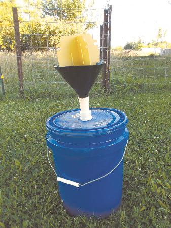 Like many other home gardeners and landscapers, Dave Taylor of Springfield, Missouri, purchased several Japanese beetle traps to place in his yard when he noticed the shiny shelled bugs starting to appear in droves.  But after having to empty the traps almost hourly throughout the day after their installation, he decided to build a trap that would hold far more beetles than the conventional bags. Now he collects the bugs in 5-gal. buckets.