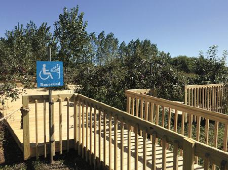 The H-shaped, 42-ft. long by 24-ft. wide green treat deck wraps around 18 Cortland apple trees and is high enough for perfect apple picking for people sitting in wheelchairs. A railing on the open side, a raised box filled with pumpkins on another side, and a 2 by 2 lip around the rest of the deck next to the trees are safety features based on advice from the University of Wisconsin-Eau Claire student disabilities office.