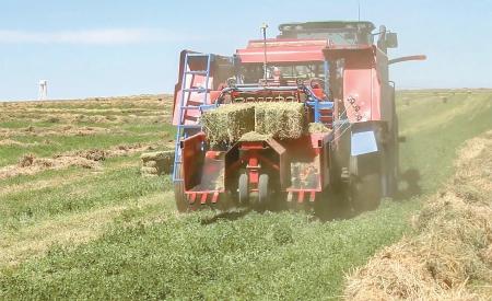 Creating the Twin Pak was an economic necessity for the Gradys. In addition to their bale handling equipment business, Grady Press Trailers, they operate J&M Baling. The company does custom harvesting of 4 crops of 23,000 acres of alfalfa and 2 crops of triticale on 3,000 acres. The contract requires a combination of small and large bales, but the profit margin on small bales was minimal.