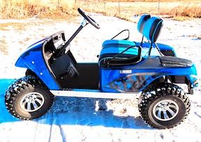Using his skills as a fabricator and painter, Jamie reworked the green body, applied custom graphics and four coats of sky-blue paint topped with six coats of urethane clearcoat. “The sun reflecting off this shiny custom cart just might wilt the grass on a freshly mowed golf course,” Jamie says with a laugh.