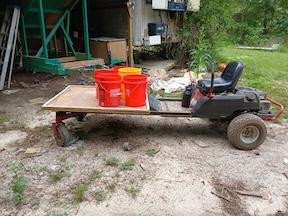 “I had a zero-turn I didn’t need, so I cut off the front end and extended the frame rails to hold a 4 by 4-ft. plywood sheet,” says Colson. “I mounted the old front caster wheels to the front of the extended frame.”