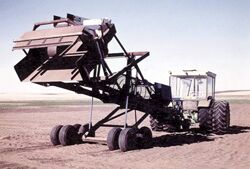 They had to design a new scissors-type lift in order to pick up and dump the enlarged rock hopper. They added two 4 ft. hydraulic cylinders, one mounted on either side, between the lift frame and the main frame near the axles to raise the box high enough to dump into a truck. A second set of smaller cylinders tips the hopper to dump it.